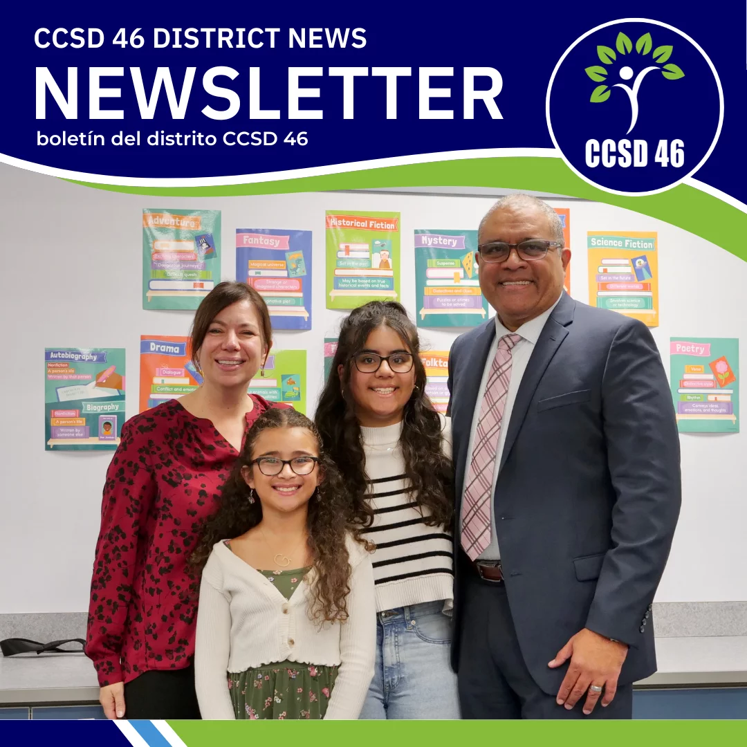 Nos complace presentarles la última edición de nuestro boletín electrónico del distrito. Durante el año escolar, cada nueva edición se publica a nuestra comunidad familiar a través de ParentSquare. El boletín también se publica aquí en nuestro sitio web (d46.org/news/). Estarán llenos de noticias y actualizaciones de varios departamentos, y están destinados a mantener a nuestras familias y la comunidad al día sobre lo que está sucediendo en nuestro distrito escolar.
